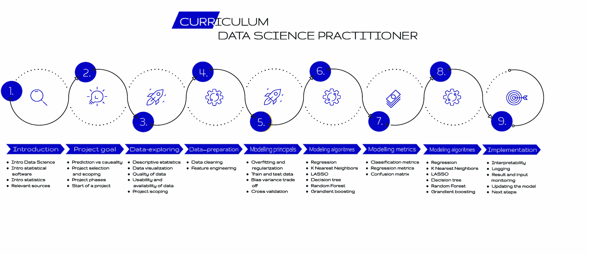 Je verwerft de basisvaardigheden en knowhow om een Data Science project op te zetten en uit te voeren. Samen onderzoeken we de mogelijkheden om data met behulp van machine learning en andere data science technieken om te zetten in echte waarde. Je leert door te doen, wat inspeelt op de vaardigheden die je nodig hebt om dataprojecten succesvol te implementeren.